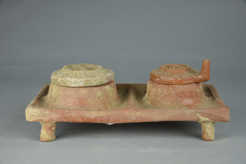 汉红绿釉双连陶磨