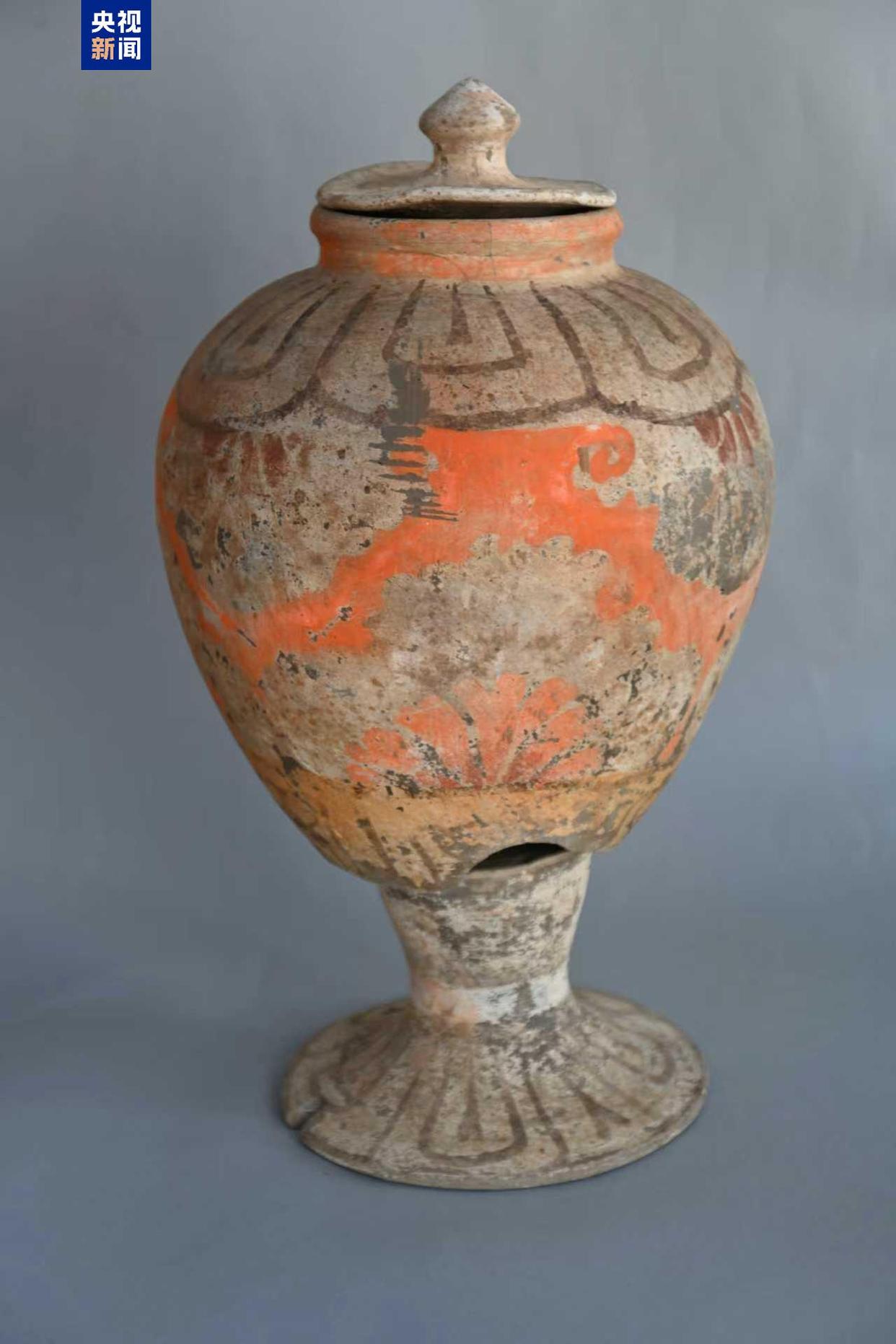 其中,唐代塔形罐由器盖、罐、底座三部分组成。盖沿微上翘,盖下面为突出的短子口,顶部有宝珠形纽。罐圆唇,溜肩鼓腹,腹下部斜收,平底。底座呈束腰喇叭状,上部为平顶,下部外撇。器表均施一层白色陶衣,然后在其上彩绘,彩绘部分脱落,残留有黑彩、朱红彩和橘黄色彩绘。