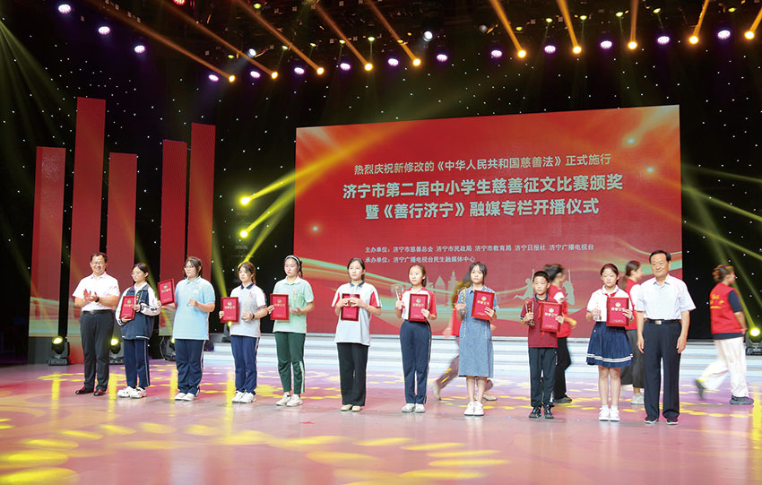为庆祝第九个“中华慈善日”和新修改的《中华人民共和国慈善法》正式施行,9月7日,山东省济宁市慈善总会、市民政局、市教育局、济宁日报社、济宁广播电视台联合举行济宁市第二届中小学生慈善征文比赛颁奖暨《善行济宁》电视专栏开播仪式,旨在推进依法兴善、依法行善、依法治善,推动济宁慈善事业高质量发展。济宁市慈善总会会长,市政协原副主席、党组副书记贾丽建出席活动并讲话,市民政局党组书记、局长马国安,党组成员、副局长王洪生等出席。